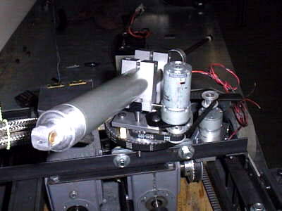 | Here is a tight shot of the pan-tilt mechanism that positions the pneumatic pike on the rear of the Ag. The top motor drives a custom leadscrew actuator to raise and lower the pike. It has a range of horizontal to -18 degrees. The lower motor pans the whole assembly through 270 degrees effectively covering the sides as well as the back. I used a really hard alloy of aluminum to machine the joints since I was using steel pins as axles. The motors were driven by another Tekin Rebel speed controller that in turn was driven by a synthesized signal from the microcontroller, a Scott Edwards Counterfeit Basic Stamp. The Stamp even ran acceleration curves on the motors, similiar to an accelerating mouse cursor. |