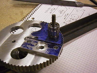 | It took me forever to figure out how to make the pike move up and down (the "tilt" direction.) I ended up with a small leadscrew actuator built into the pan ring gear, backed up by bearings. The trick was making something strong enough that wouldn't break when subjected to the 150 lb. reaction force of a shot. The other trick was to make it out of aluminum for weight (and because I hate machining steel - see below.) It worked really well. |