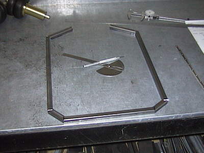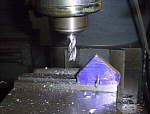 To the right I'm employing a quick trick on using a mill to rough out a circle. Simply fix the vertical height of the cutter, make a pass, then rotate the part on some axle. It lets you get really close in a few minutes with a minimum of setup changes. |