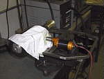 | The new Al hub was tapped in three places to permit the older plastic version to be clamped through with some 1/4-20 cap screws. By squeezing the core of the tire I was going to transmit torque to the tread. You can't drill through this foam without it ripping apart. So I heated up a chunk of key stock in the torch and burned clearance holes for the cap screws. I never turn down a chance to work with fire. |
