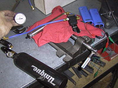 I really scored on the wheel mounts - surplus aerospace stuff from the Surplus Center catalog. A stainless steel shaft with pressed-on ball bearings all in a flanged aluminum housing for $7. Here I am tapping the mounting holes for attachment to the frame. |  |
